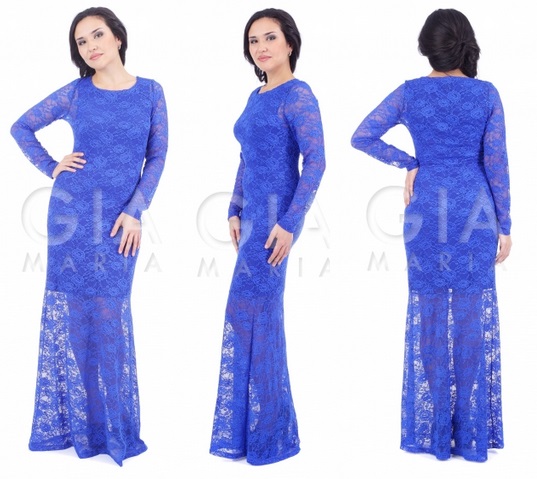 Цвет: ярко-синее кружевное полотно на фоне синего платья-основы. Нарядное праздничное платье в пол с длиным рукавом из великолепного кружевного полотна. Юбка резаная выше колена скроена полусолнцем. Длина платья по спинке - 1,45 м.
